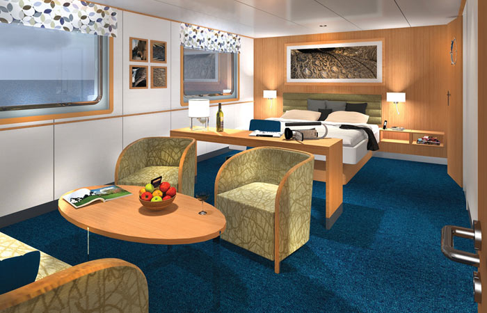 The Darwin Suite, located on the Panorama Deck, measures 325 square feet (30 square meters), with double picture windows, providing superb comfort and deluxe amenities for more discerning guests. Additionally, the suite can be interconnected with an Explorer double cabin to increase space by another 163 square feet (15 square metersBeds: 2 large twin beds convert to double (105 cm x 91 cm) x 2Bedding: Superior quality bed linen in all cabins. 2 pillows, one hypoallergenic and one with memory foam. Sheets are 60% cotton and 40% polyester of the best quality and duvet as a cover. Panorama deck cabins have 2 extra pillows of same type. Windows: 2 (138 cm x 90 cm)Balconies: NoneCabin Furnishings: 2 night desks, 2 chairs, 1 corner desk, 1 sofa, 2 small armchairs, 1 center table, 1 high tablePrivate Bathroom: Yes, with showerBathroom Amenities: Biodegradable shampoo & soap, hairdryer, mirror, facial tissue, towels. Under request at reception we have available for guests: sewing kit, shower cap and vanity kits.Cabin Amenities: Walk-in closet and space under bed (space for suitcases); telephone; iron (upon request); pen & memo pad; expedition map; sports bottle; extra blanket; inset tablet with free WiFi in each suite available for use during trip upon request; in-cabin national and international magazines.